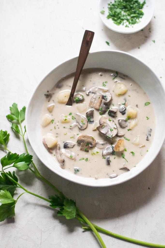 Creamy soup loaded with lots of mushrooms and potato, a hint of garlic and herbs, and cooked in 35 minutes.