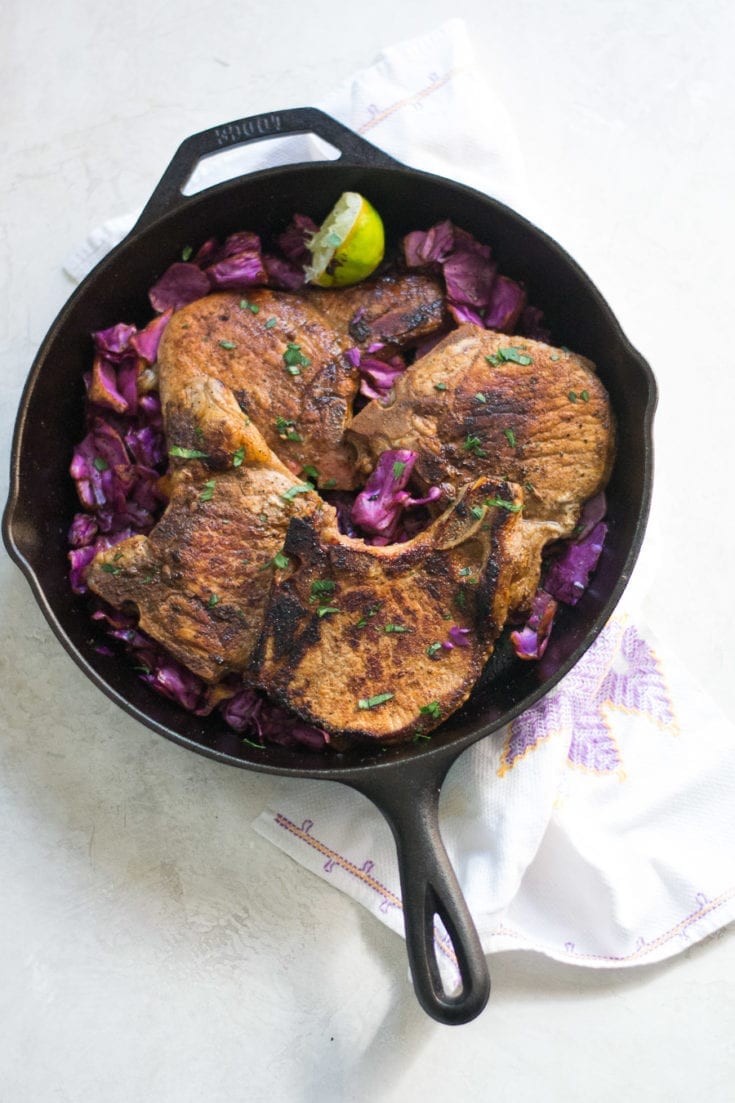 Pork chops with red cabbage is the easiest one pan meal. Pork chops marinated overnight and then pan fried. Wilted red cabbage picks up all the juicy pork bits from the pan.