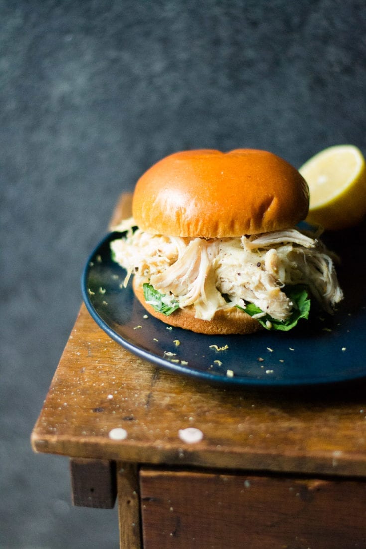 All you need for this recipe is boneless, skinless chicken breasts, 2 lemons, 5 garlic cloves, dry white wine, salt, and pepper. The result is a juicy, tart, suuuuper garlicky shredded chicken. It’s perfect on top of a toasty bun with fresh baby spinach for crunch and some shredded mozzarella cheese.