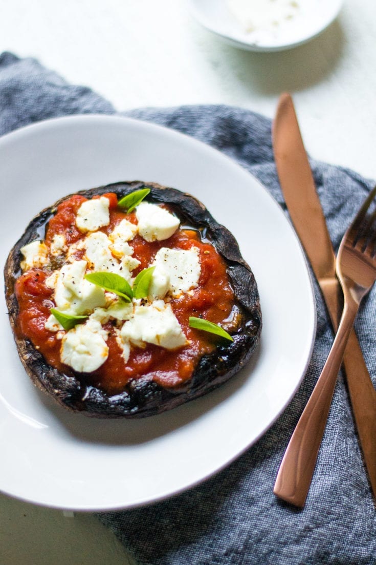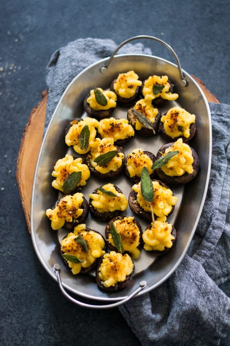 Creamy mac and cheese stuffed inside broiled baby bella mushrooms topped with breadcrumbs and fried sage.