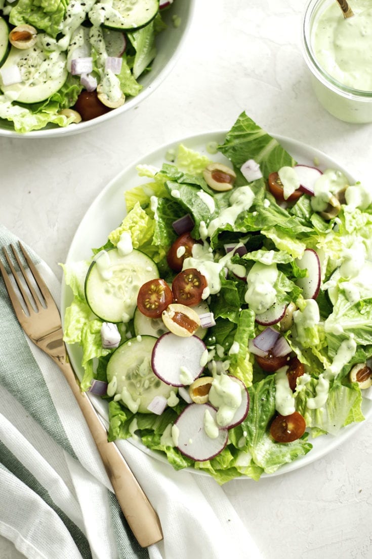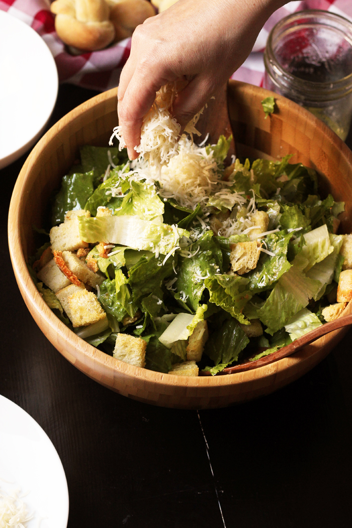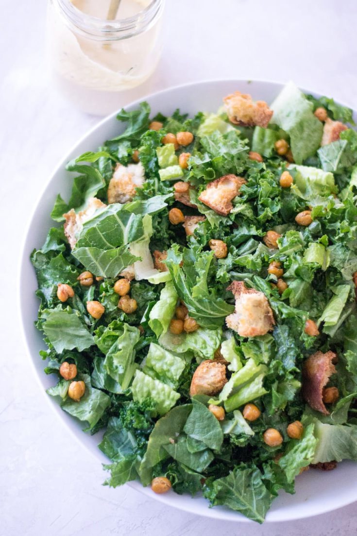 Vegan kale Caesar salad with a creamy tahini based dressing, crispy chickpeas, and crunchy homemade croutons.