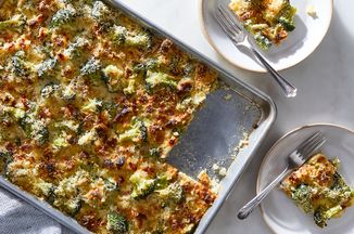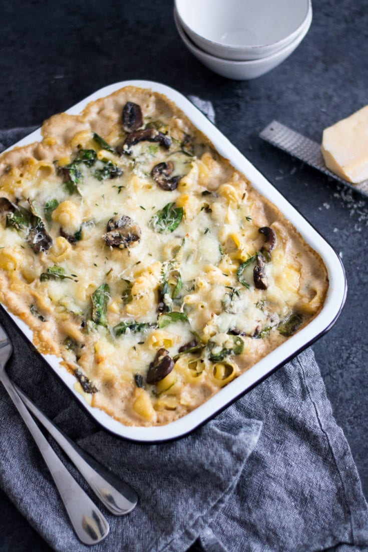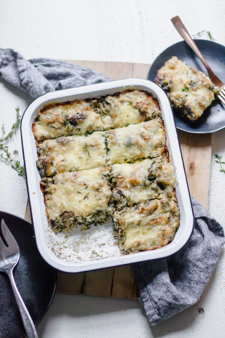A cheesy mixture of rice, sautéed spinach, mushrooms, and onions baked up until crisp and bubbly.