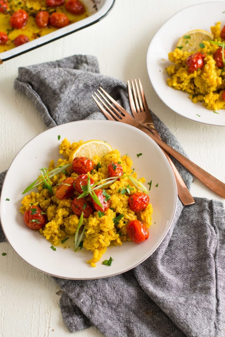 Smoky turmeric rice and lentils made in the Instant Pot wile tomatoes are quickly roasting in the oven.