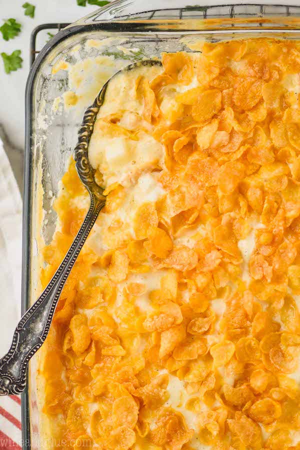 Creamy, dense, and decadent make-ahead refrigerator mashed potatoes are easy and loaded with butter, sour cream, and cream cheese then baked the day of until little crispy edges form.