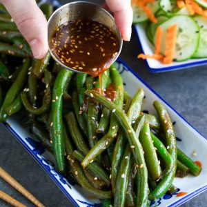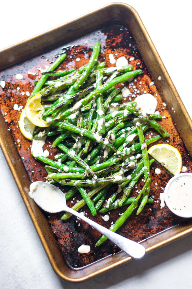 Grilled, charred fresh green beans served with a lemony, garlic, tahini sauce on top.