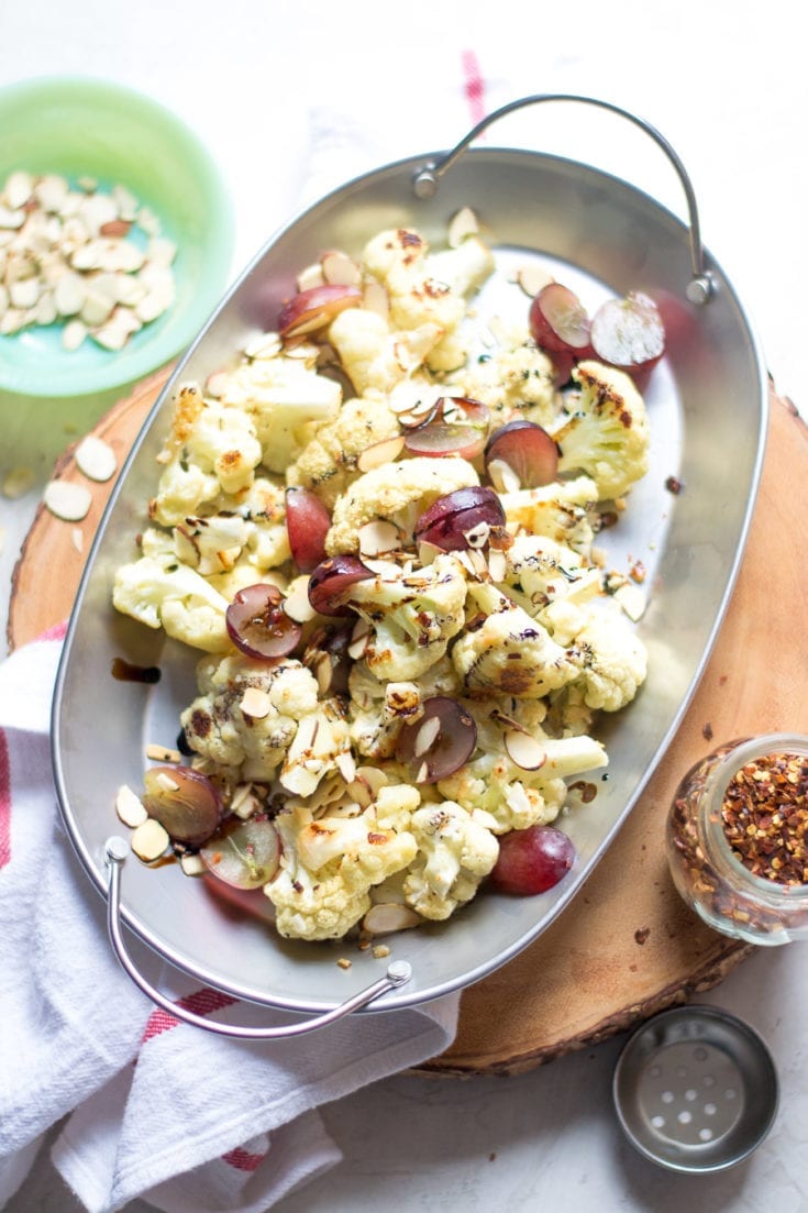 Roasted cauliflower and grapes with lots of garlic, crushed red pepper flakes, and crunchy almonds.