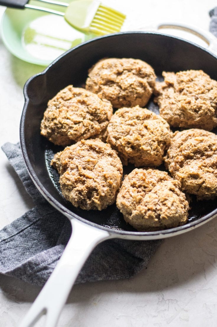 Buttery and soft honey whole wheat drop biscuits made in one bowl and one cast iron skillet.