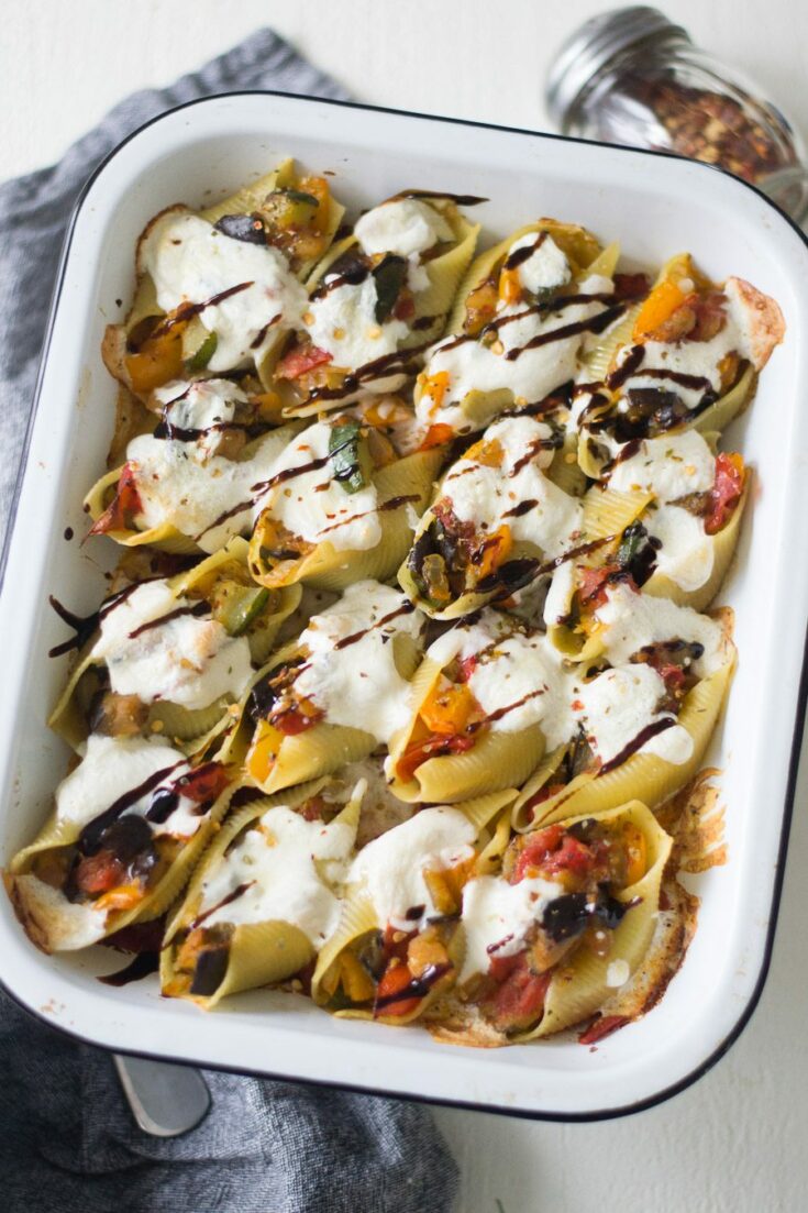 Shells stuffed with eggplant, tomatoes, peppers, onion, and zucchini and then topped with cheese and baked until melty and golden.