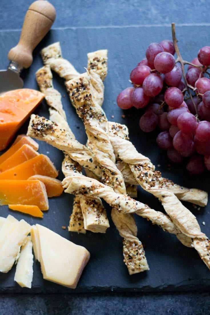 Store-bought puff pastry lightly coated in melted butter, topped with everything bagel seasoning, and then twisted and baked until crisp. They look way fancier and more complicated than reality.