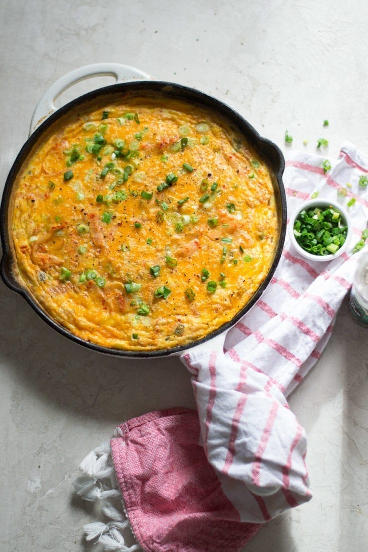 Kimchi and cheddar frittata is easy to whip together with only 5 ingredients. Eggs baked with sharp cheddar cheese and chopped spicy Napa cabbage kimchi. Top with some chopped green onions and feed a crowd.