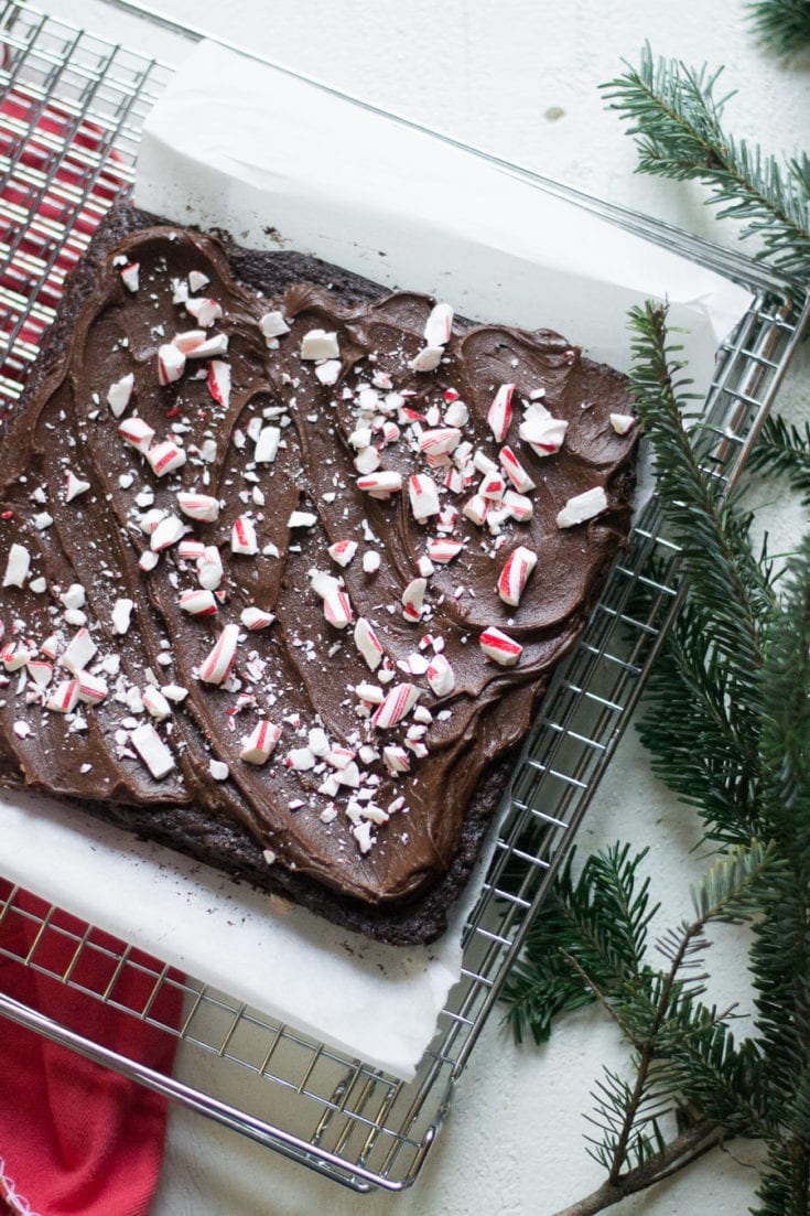 Peppermint Schnapps spiked chocolate glaze or frosting is what takes these brownies to the next level. The crushed candy canes on top are super festive.