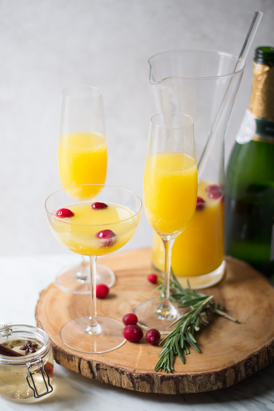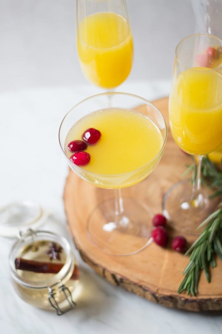 Spiced cinnamon orange mimosas are a way to have the same holiday mimosa with a festive spice-infused twist. A simple syrup infused with cinnamon, star anise, and ginger adds a warming sweetness to this brunch beverage.