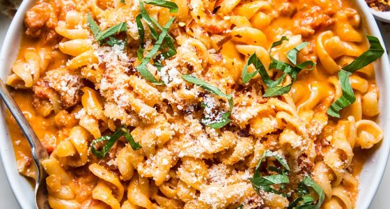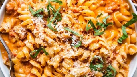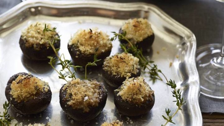 Creamy mac and cheese stuffed inside broiled baby bella mushrooms topped with breadcrumbs and fried sage.