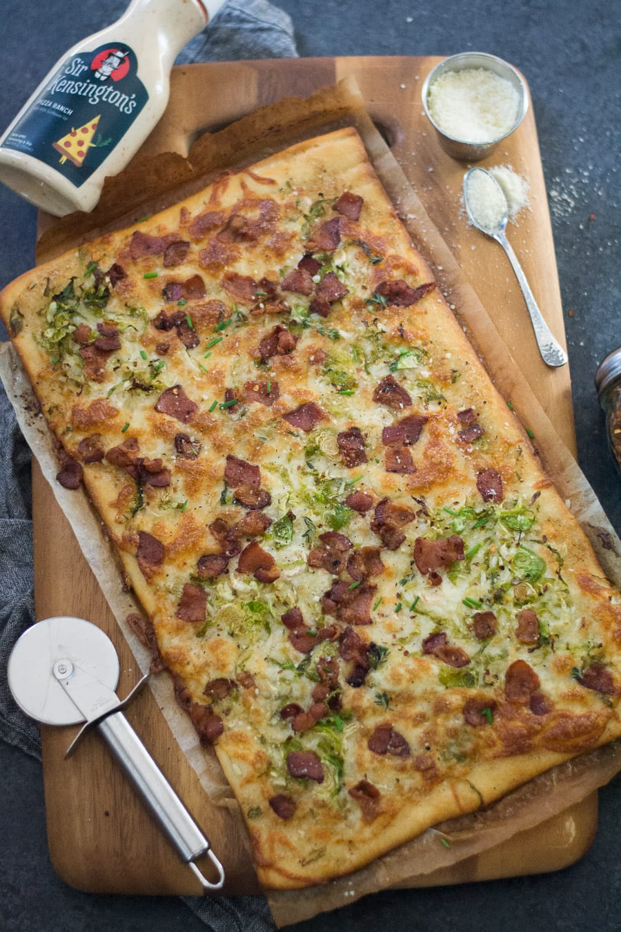 Use your favorite store-bought dough or crust. Top the crust with some good ol’ Hidden Valley or my new personal favorite Sir Kensington’s Pizza Ranch. Sprinkle with cheese, shredded Brussels sprouts, and some partially cooked bacon pieces.