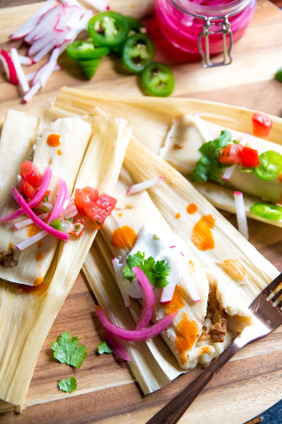 This recipe for tamales is from my second book, The Big Book of Instant Pot Recipes. It isn’t very traditional. There is stock used in the place of the lard/fat. You do also add in a bit of canola oil to the tamale filling so that does help with the moisture factor.