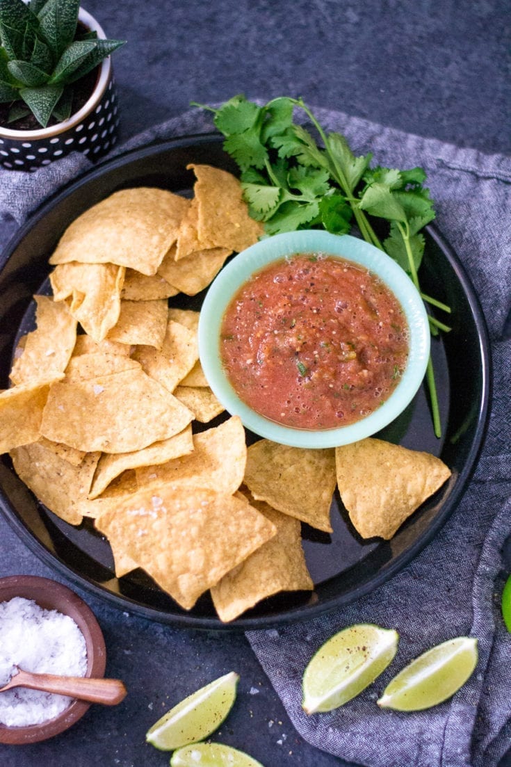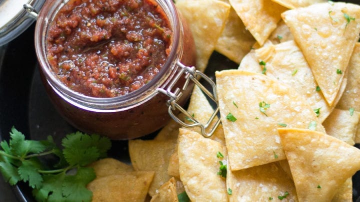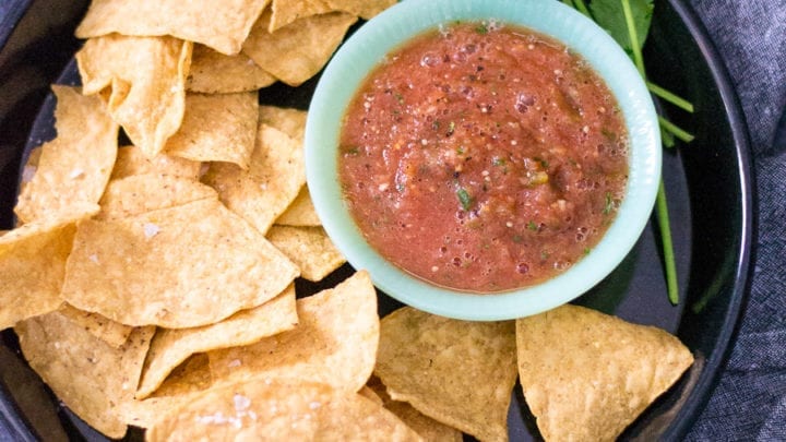 Homemade restaurant style salsa made with canned fire-roasted diced tomatoes, lime juice, garlic, onion, jalapeño pepper, and spices all in your food processor.