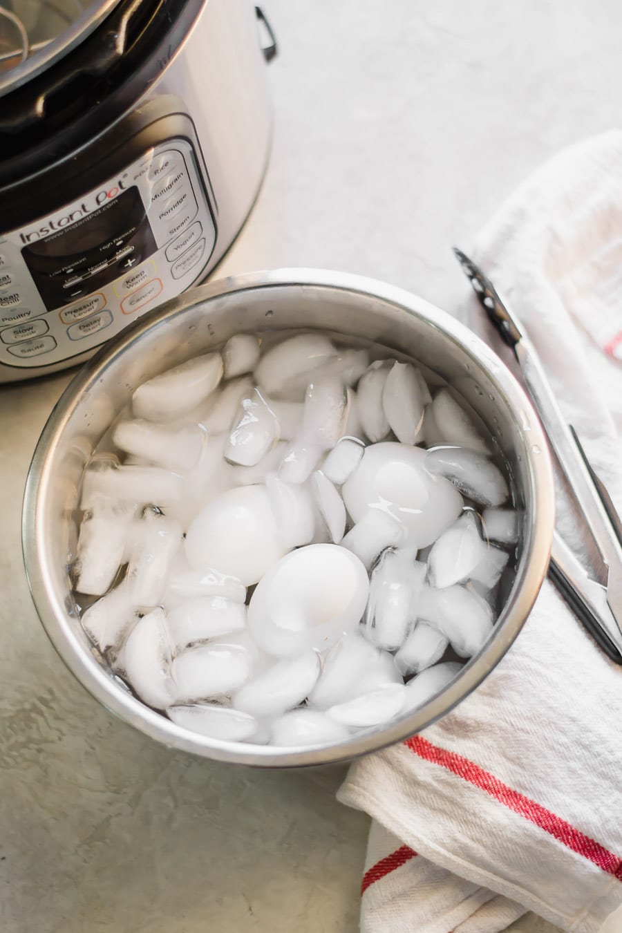 - When the timer sounds, hit "cancel." Grab your tongs and then quick release the steam. Remove the lid and use the tongs to transfer the eggs to the ice bath.
