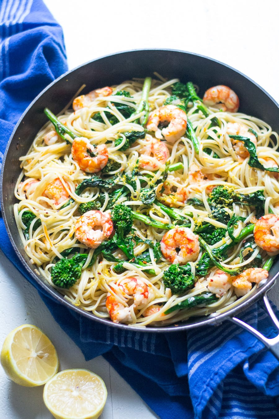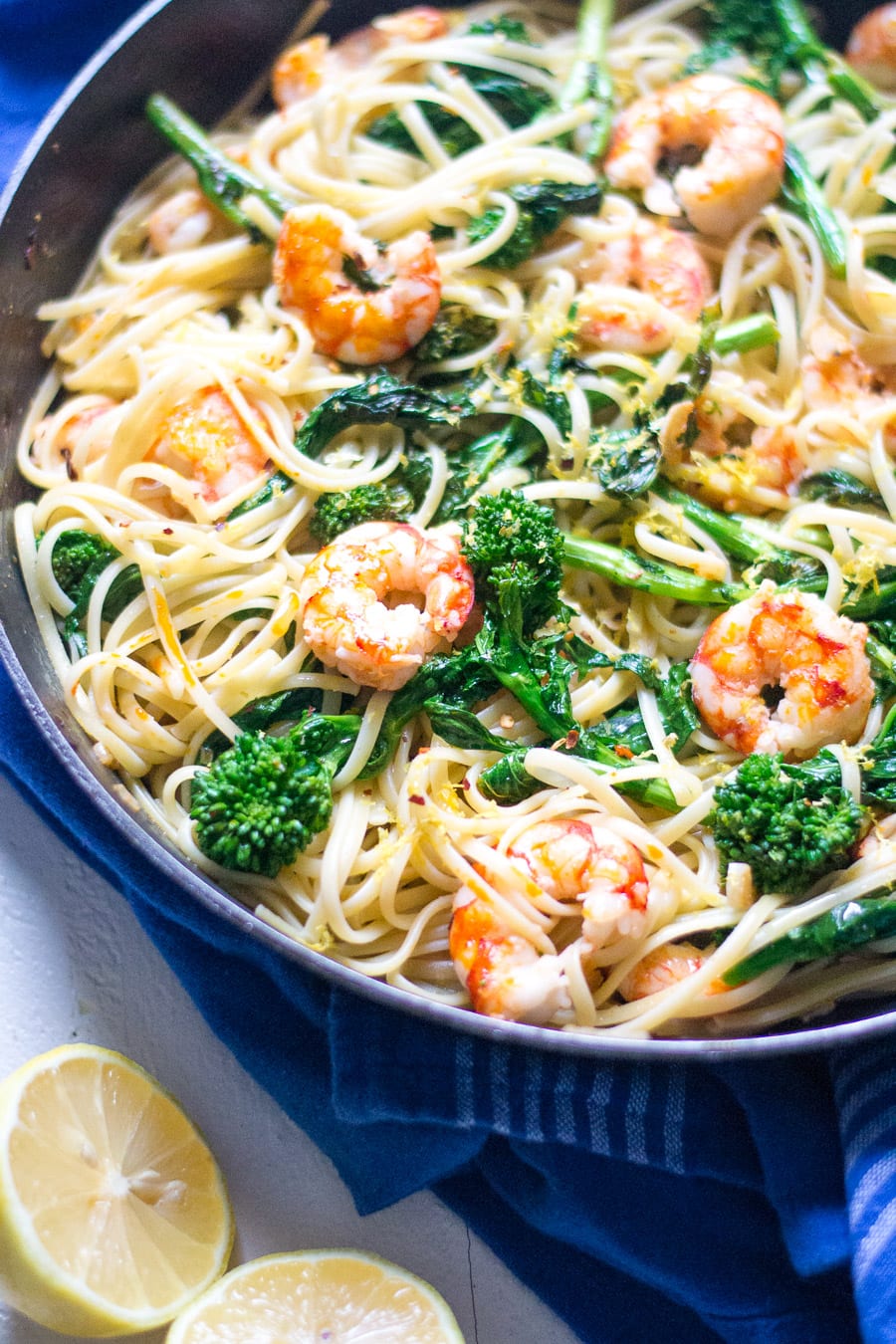 - Use tongs to transfer the noodles into the skillet with the shrimp and broccolini. Toss to coat. Add the lemon zest and juice. Cover with a lid and cook for 3-5 more minutes until the pasta is completely cooked through.