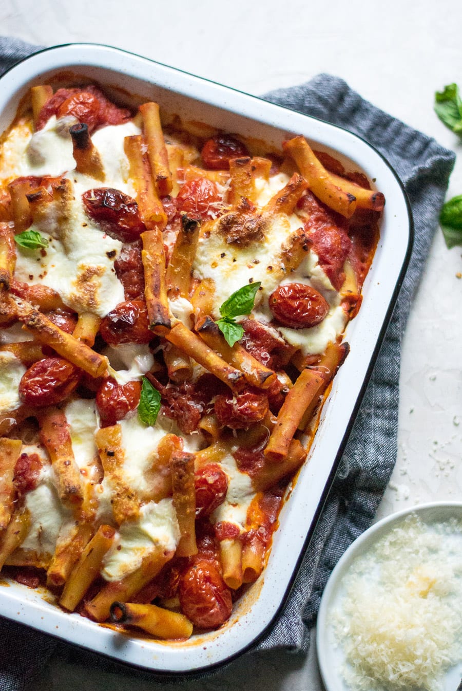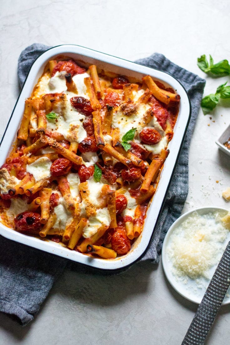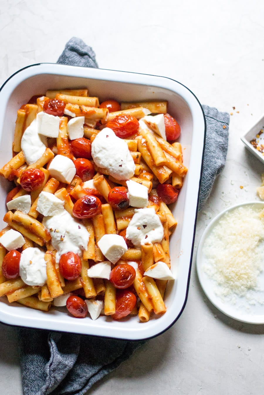 Burst tomato baked ziti combines broiled and burst tomatoes with creamy ricotta, fresh mozzarella, and marinara sauce. It’s indulgent and tomato-packed at the same time.