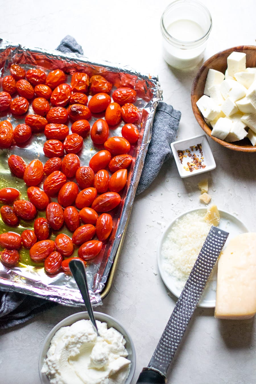 I love a good baked pasta recipe. My classic lasagna recipe is one of my favorites. On nights when I don’t wanna do the whole meat sauce from scratch, I turn to my trusty broiler to burst and blacken some cherry or grape tomatoes.