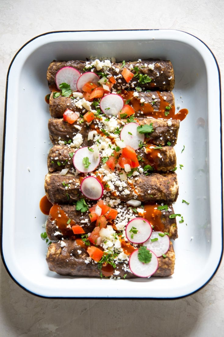Cheese enchiladas with black bean sauce, also called enfrijoladas, are the perfect way to get more veggies while still enjoying all that gooey cheese. A quick sauce comes together using canned black beans. Fill the tortillas with cheese or add in your favorite meat.