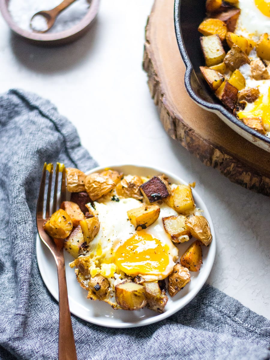 Baby potatoes are cooked until just about crisp in a cast iron skillet. Right before you crack the eggs into the skillet, you add some oil, chili flakes, and fresh garlic.