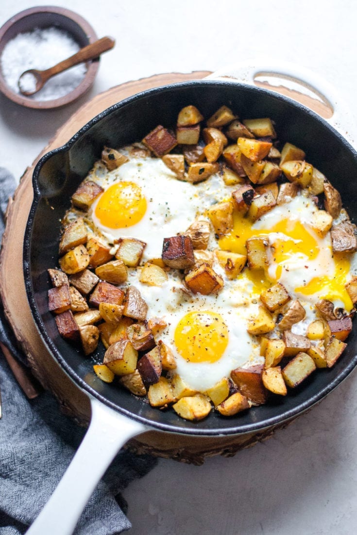 - Create spots for the eggs by moving potatoes to the side. Crack the eggs into the wells. Cover with a lid and cook over medium/low for about 5 minutes until the whites have set.