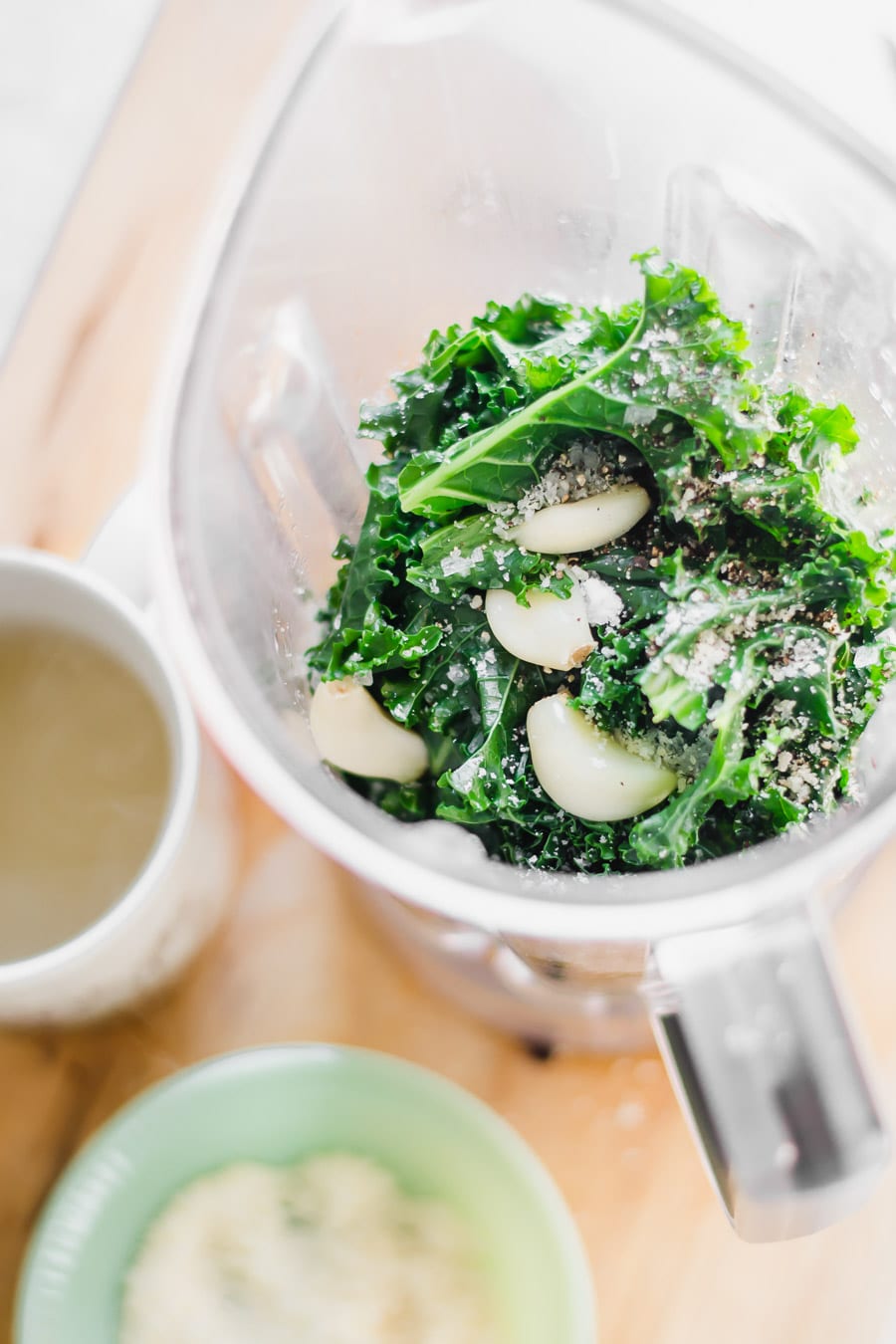Kale and garlic blanched in cooking pasta water with the noodles. The greens and garlic get pureed with olive oil and Parmesan cheese.