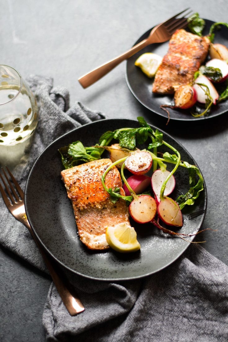 Crispy skin sockeye salmon and tender radishes and radish greens cooked in a simple brown butter pan sauce.