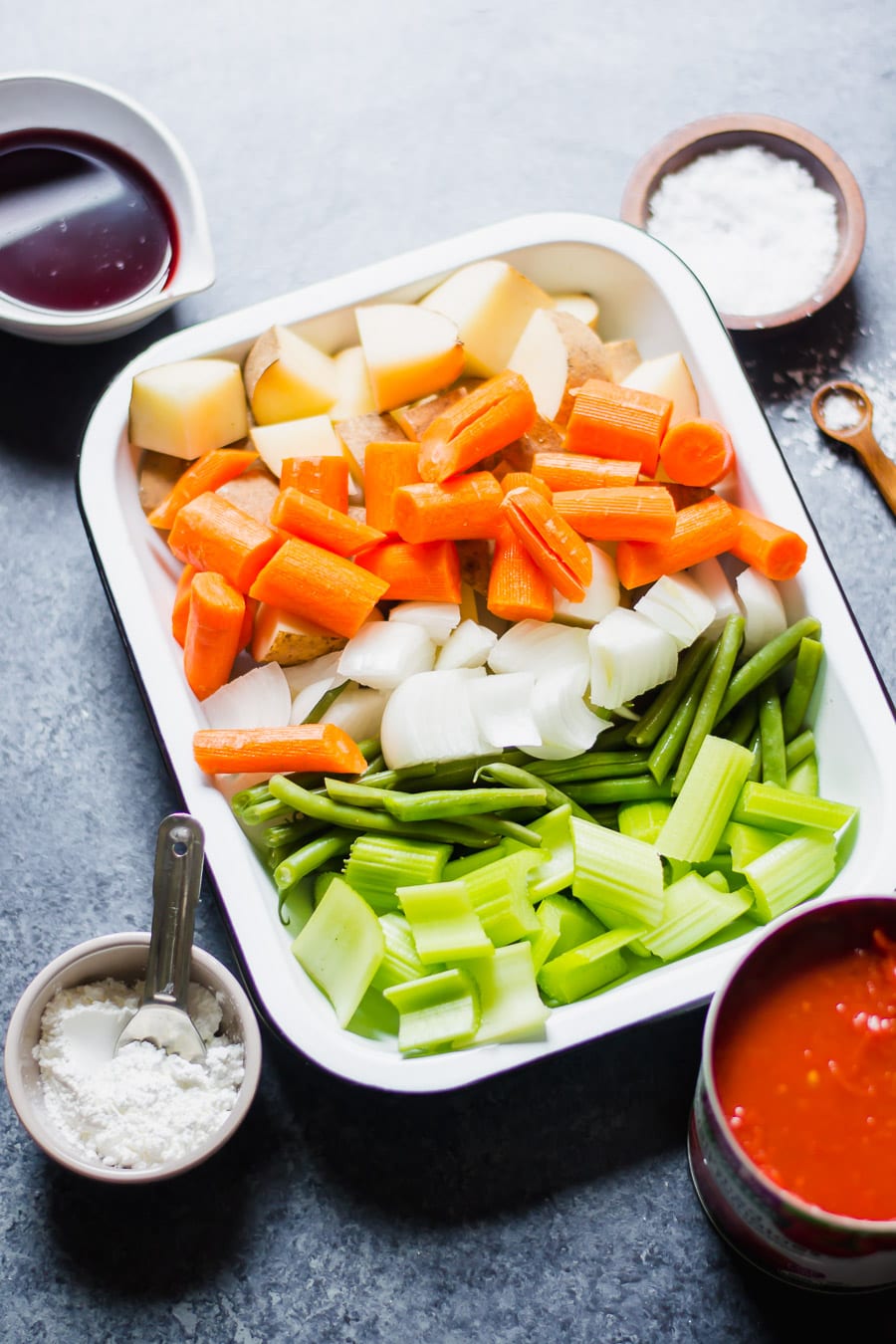 Roughly chopped onion, potatoes, green beans (fresh or canned), celery, and carrot are mixed together with some wine, crushed tomatoes, stock, salt, pepper, and corn starch.