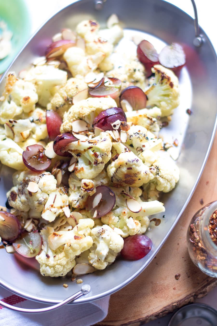 Roasted cauliflower with grapes and almonds is sweet, savory, crunchy, and so easy to make. Cauliflower is roasted with red grapes, almonds, garlic, and crushed red pepper flakes.