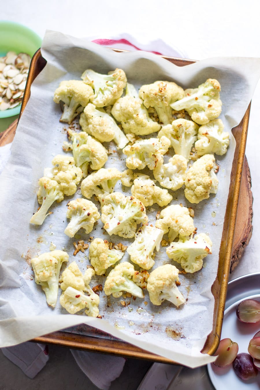 - Toss the cauliflower, grapes, garlic, olive oil, salt, pepper, and crushed red pepper together in a large mixing bowl. Add the cauliflower and grapes to the baking sheet. Roast in the oven for about 20 minutes until golden and tender.
