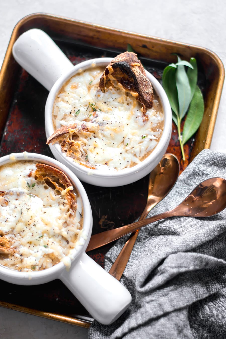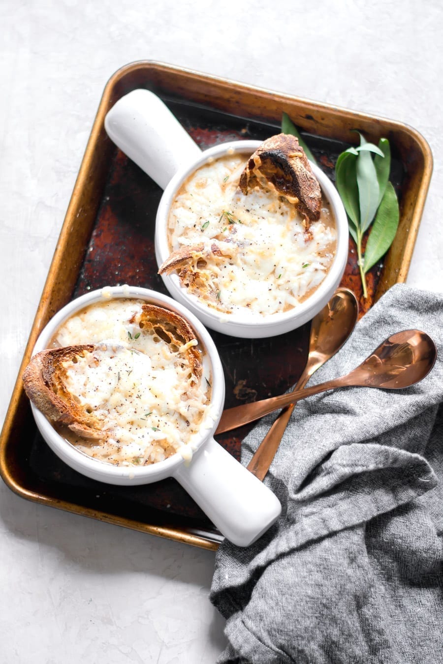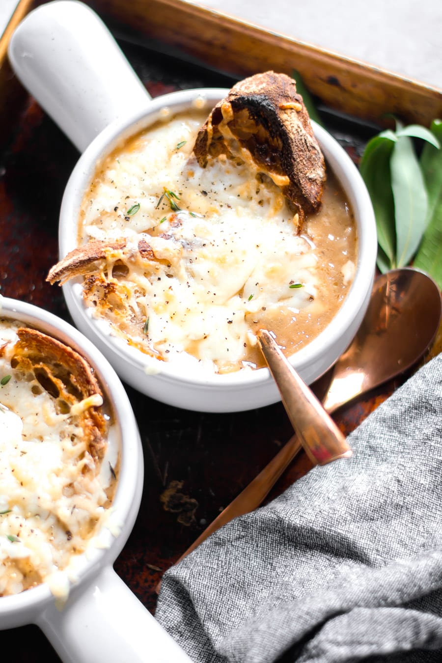 Easy French onion soup is made with five onions, bourbon, beef stock, and water. Pick a bread, toast it, toss it on top, cover in whatever cheese you like, and then broil. It cannot get any easier!