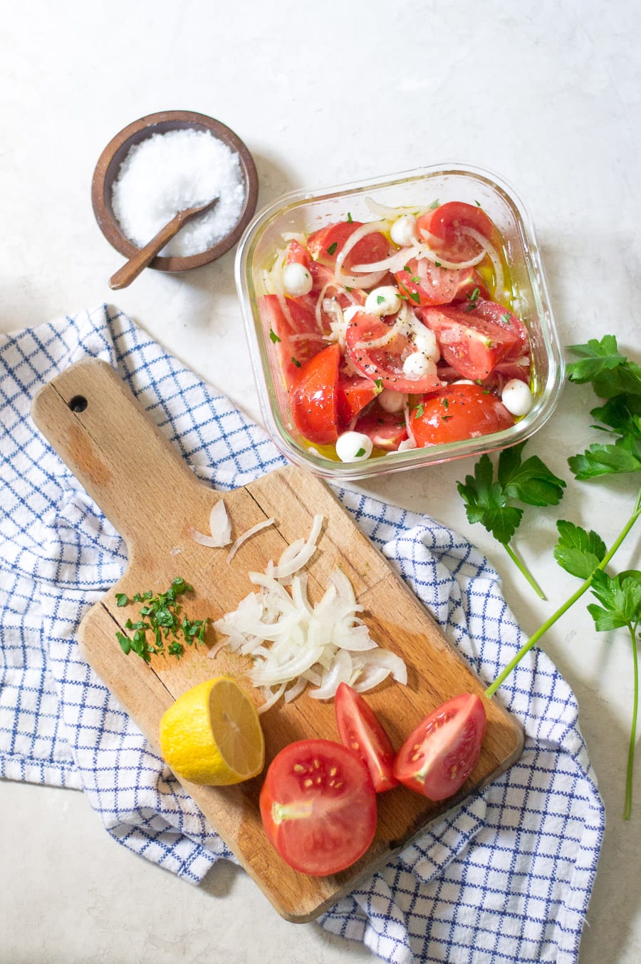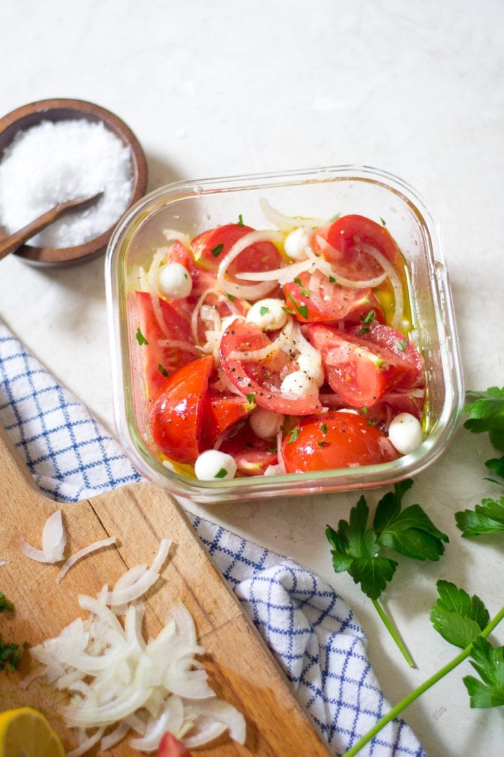 A simple deli-style tomato, onion, & fresh mozzarella salad marinated in lemon, white wine vinegar, olive oil, and garlic.