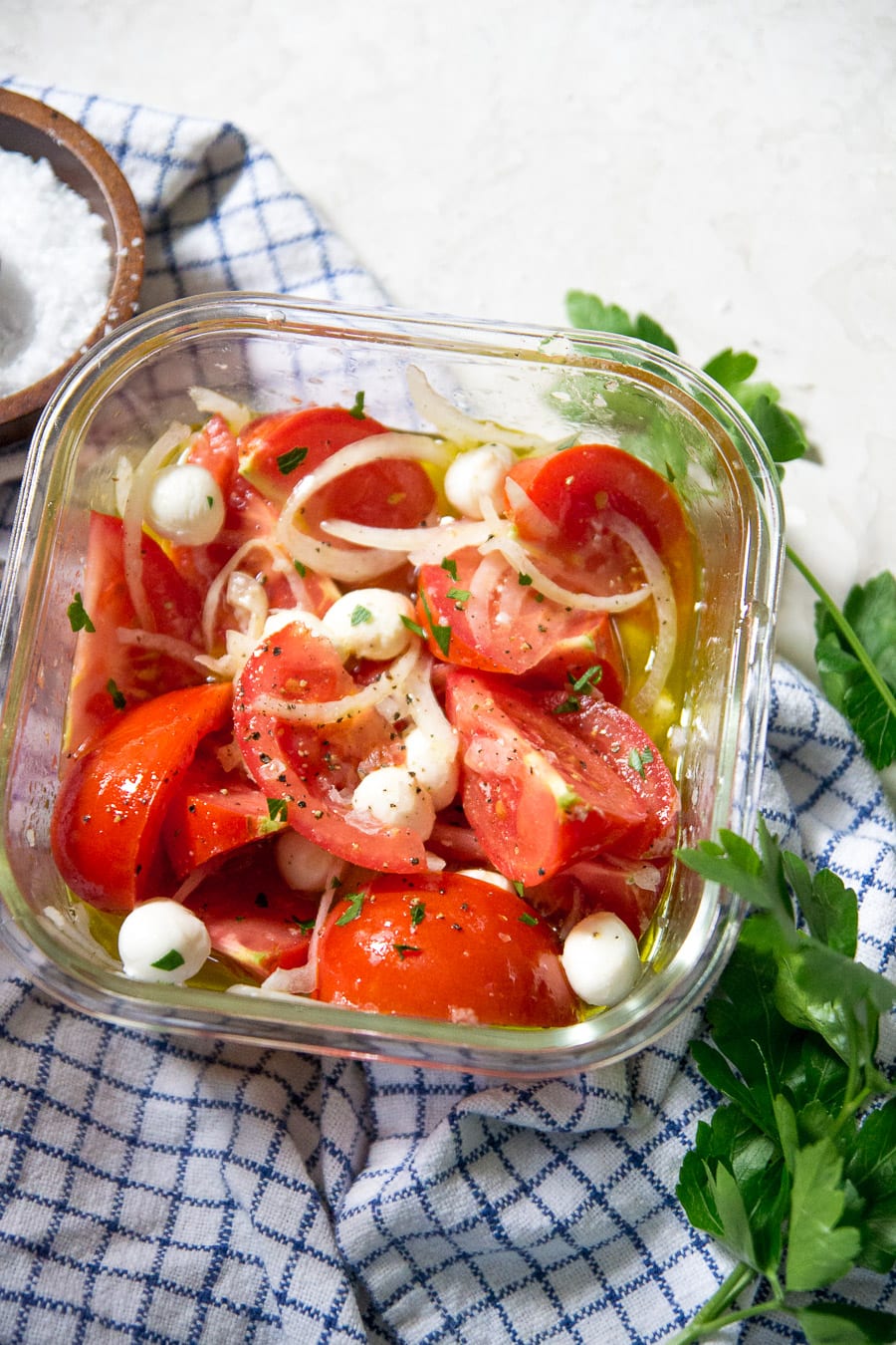 I like to leave the marinated tomato and mozzarella salad at room temp for a little bit so everything can combine. You can also refrigerate the salad and just toss it in the microwave for 10-15 seconds so the oil comes to room temp.