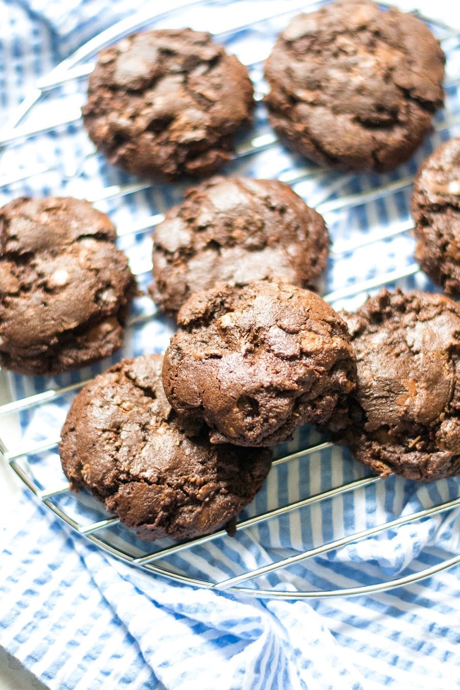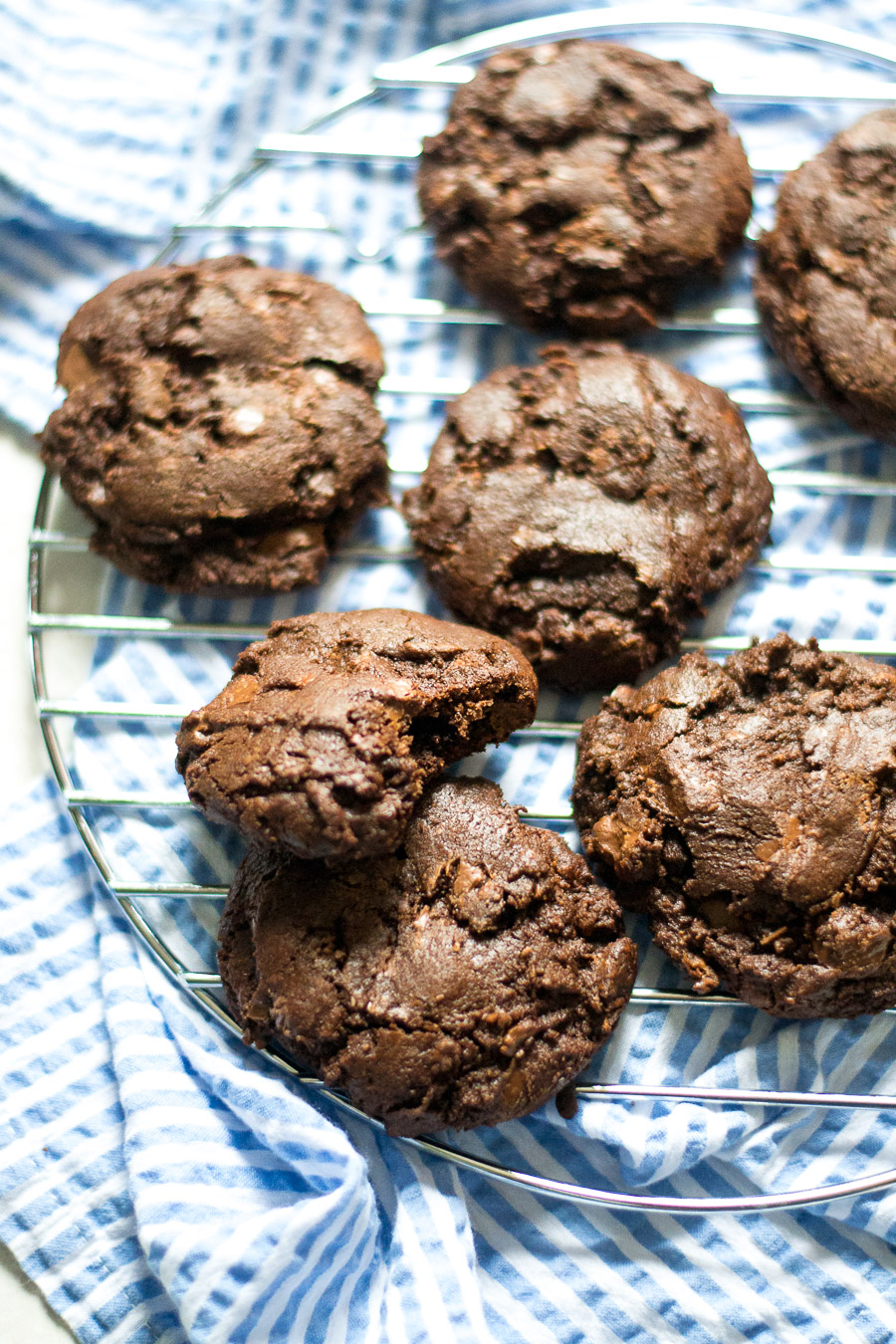 Double chocolate chocolate chip cookies are like all the best part of a brownie in cookie form.
