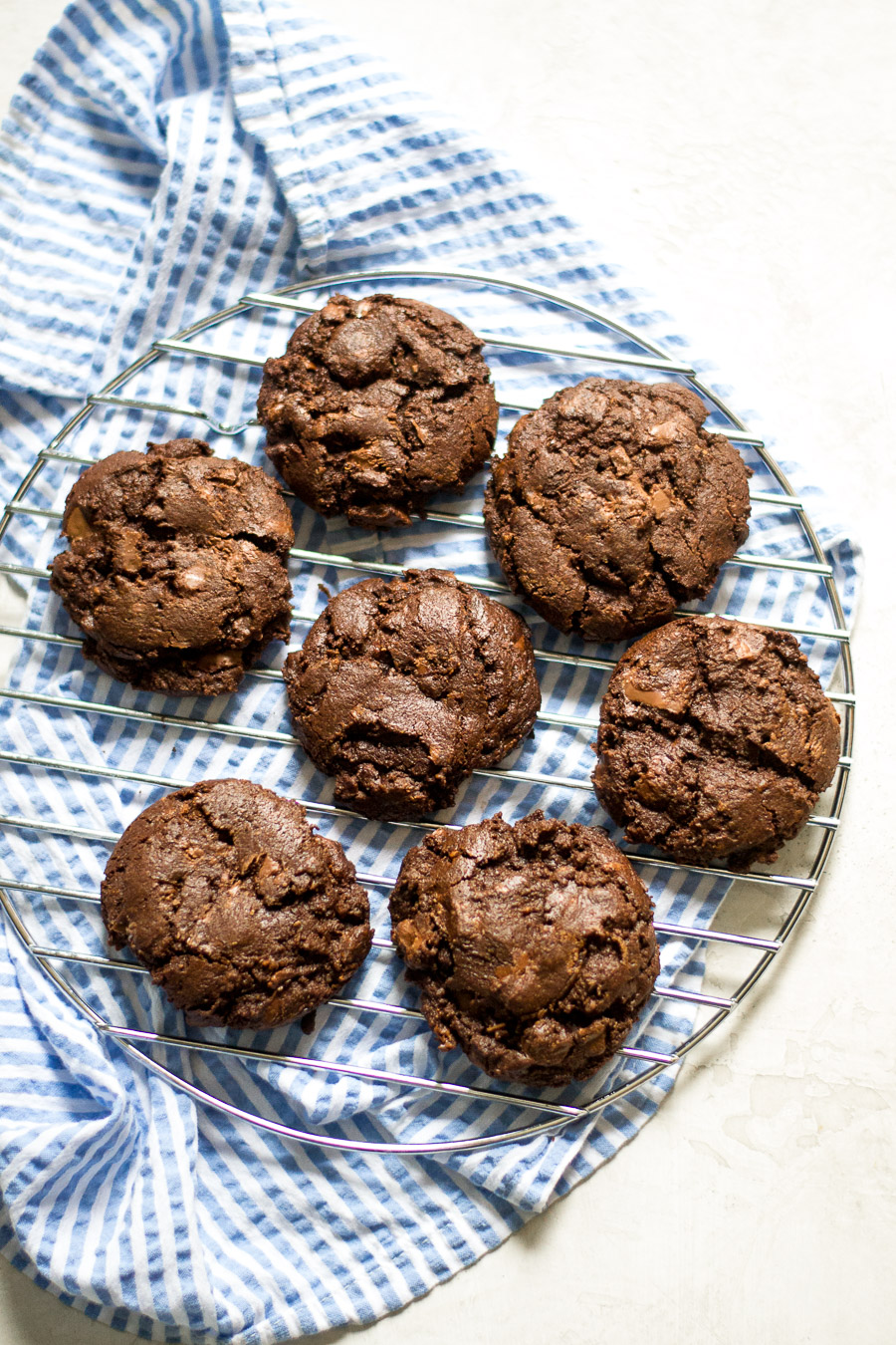 Double chocolate chocolate chip cookies are like the best part of a brownie in cookie form. The dough is a little bit of work, but it is so worth it for all that brownie edge goodness.