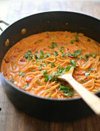Serve the pasta over your favorite sort of noodle. I really like a tube shaped noodle like penne, ziti, or rigatoni. I wouldn’t turn away from a little spaghetti, bucatini, or fettuccini though.