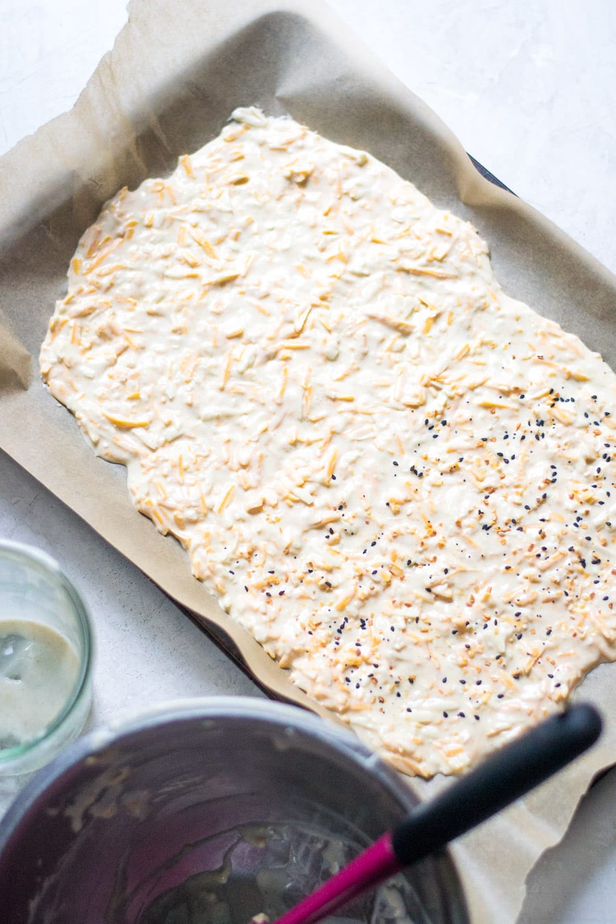 - Spread the mixture out over the parchment using a rubber spatula. Make the layer as thin as possible while still covering the parchment. Sprinkle the top with either salt or the everything bagel seasoning.