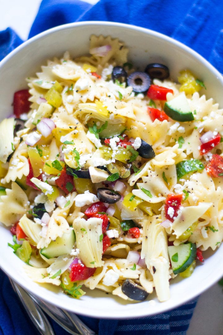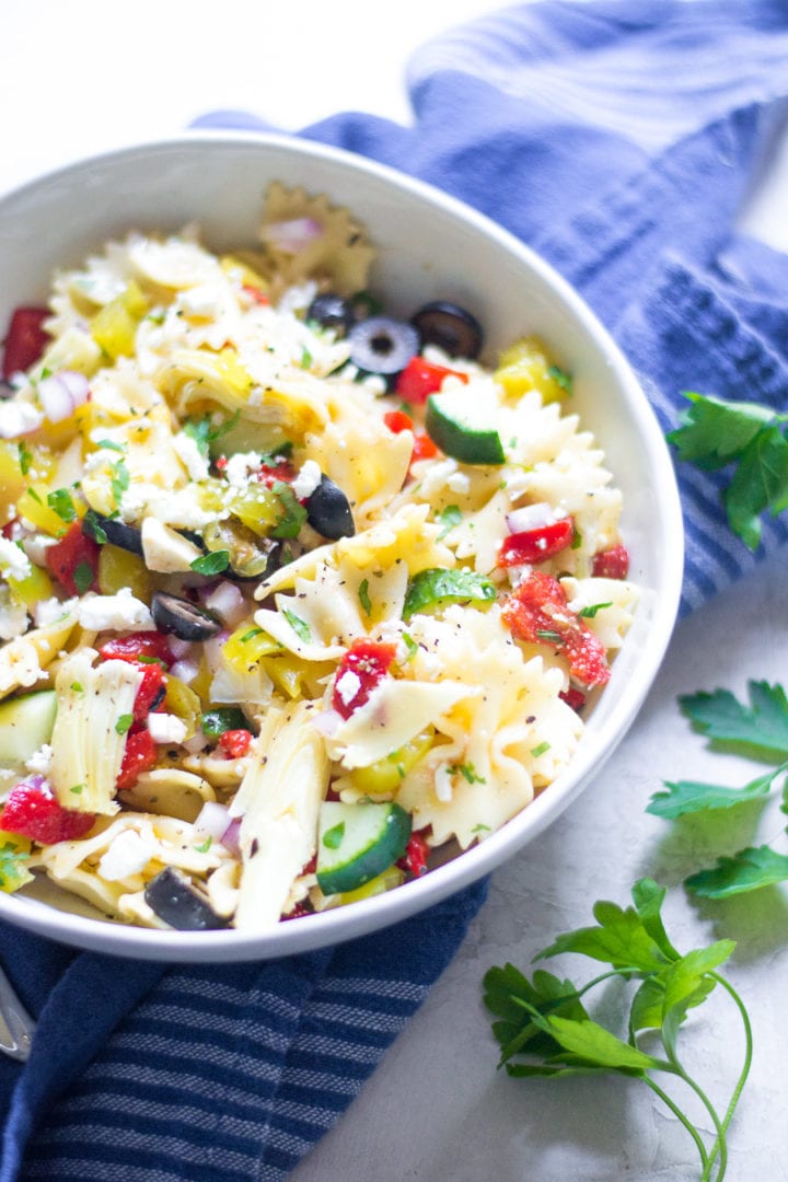 Greek pasta salad is basically a classic Greek salad with the addition of bowtie pasta. A mix of pasta, roasted red pepper, cucumber, red onion, feta, and a easy red wine vinaigrette. The perfect summer bbq side dish.
