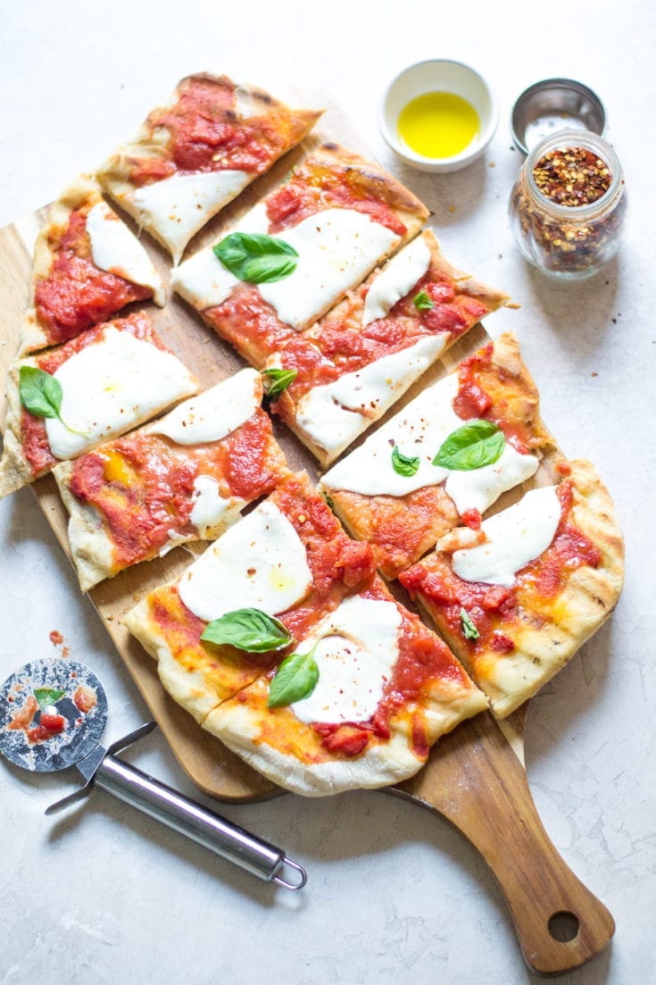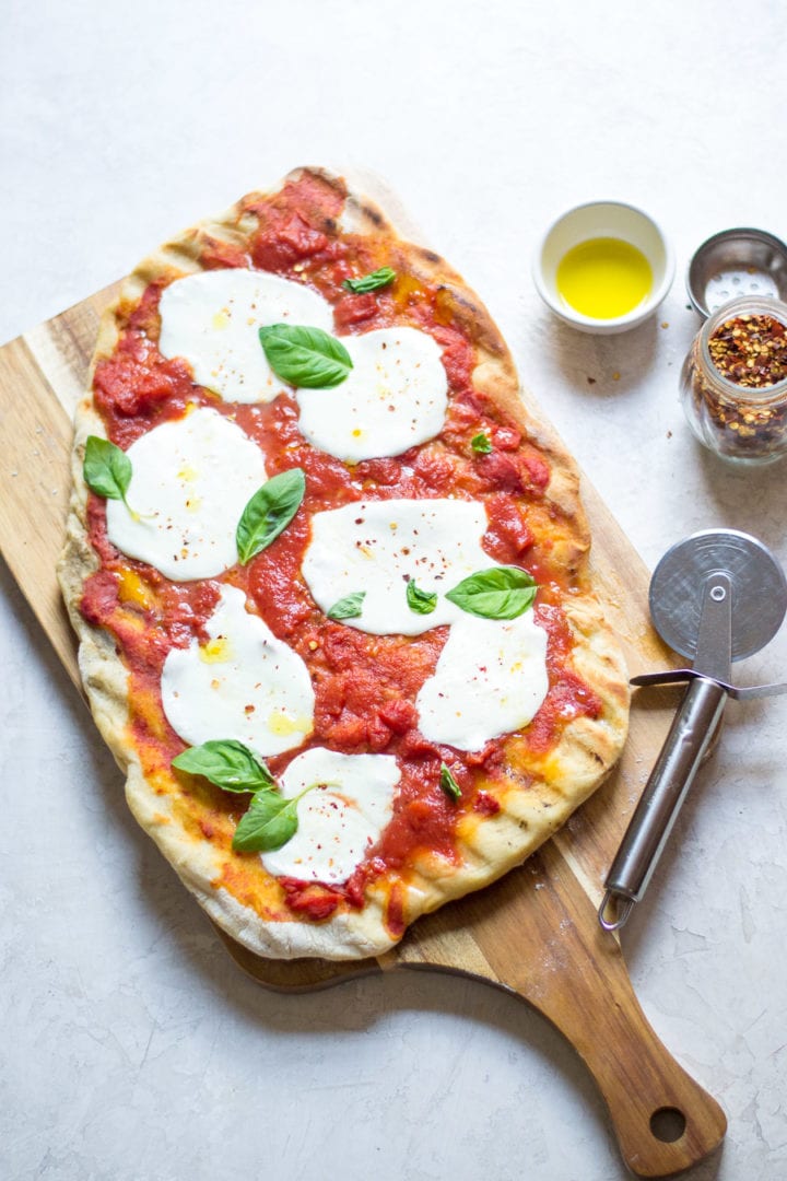 I like to use San Marzano crushed tomatoes and fresh, sliced mozzarella to make the best grilled Margherita pizza.
