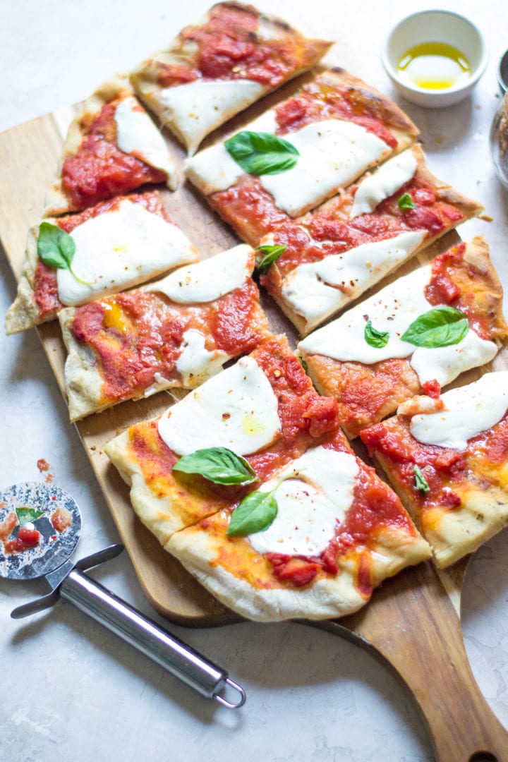 I like to use a store-bought pizza dough or a pizza dough kit for this recipe. Try my yeast pizza dough if you are looking to make dough from scratch.