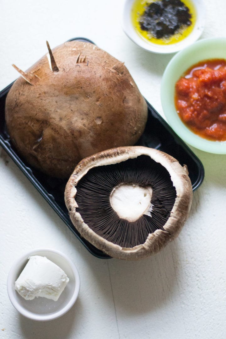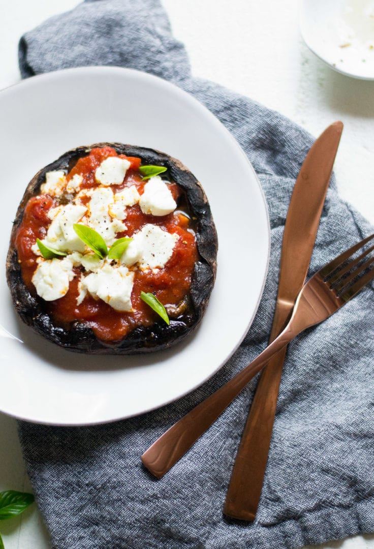 Bring your shrooms inside. Fill each portobello with a little of your favorite tomato sauce or marinara.