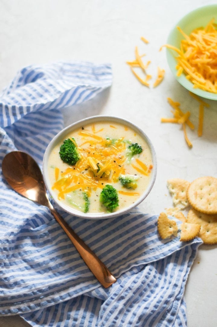 The key to an easy broccoli cheddar soup is using steamed frozen broccoli along with a pretty basic soup base. Same great, slow-cooked copycat Panera flavor in less time.