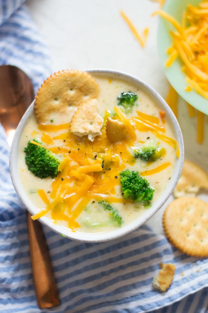 Easy broccoli cheddar soup is creamy, cheesy, and made with steamed frozen broccoli to save time.