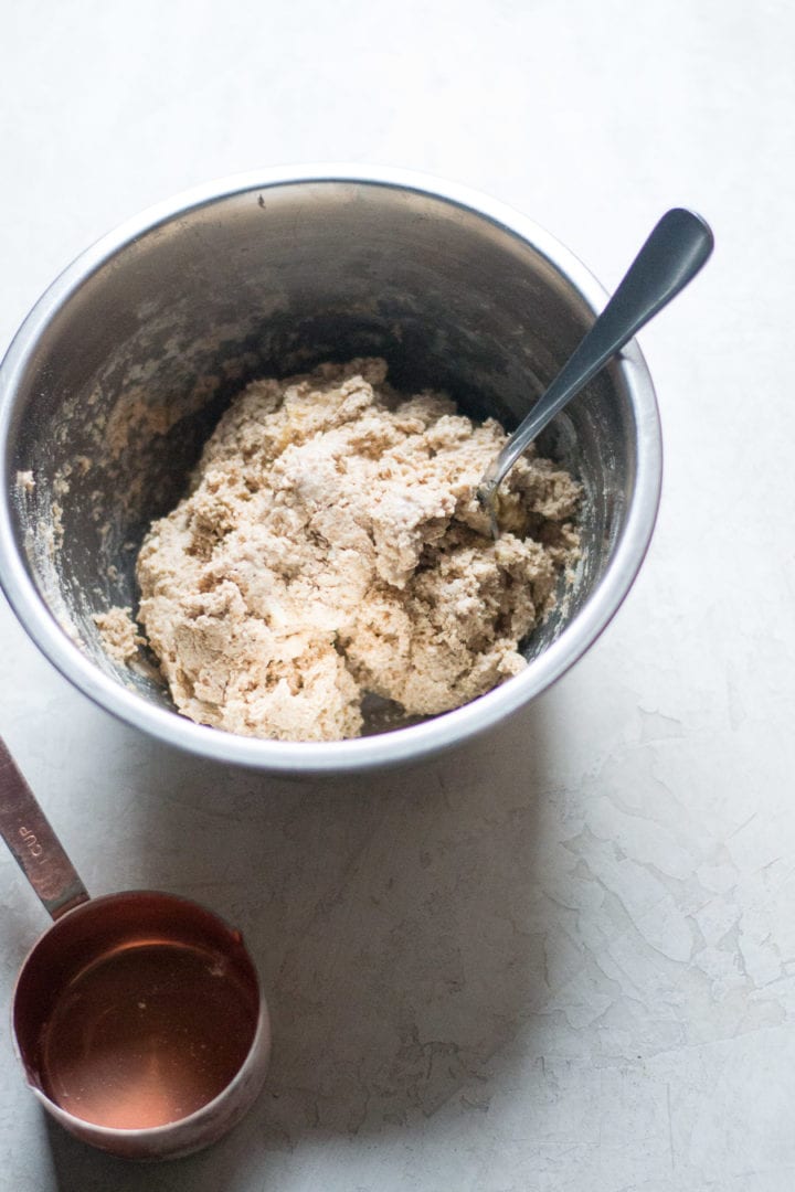 - Add the honey and buttermilk, use a fork to combine. The dough is fully mixed once you see no more dry flour bits.