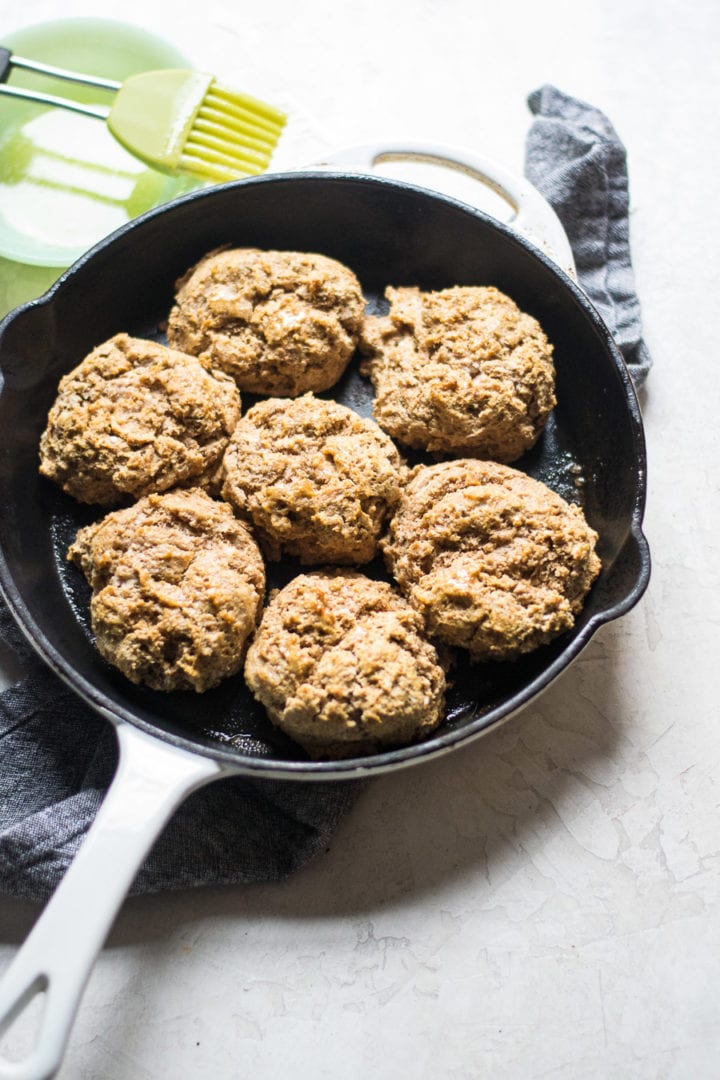 Homemade honey wheat drop biscuits are a slightly sweet alternative to regular dinner rolls or biscuits. All you need is one bowl and one cast iron skillet to get going.