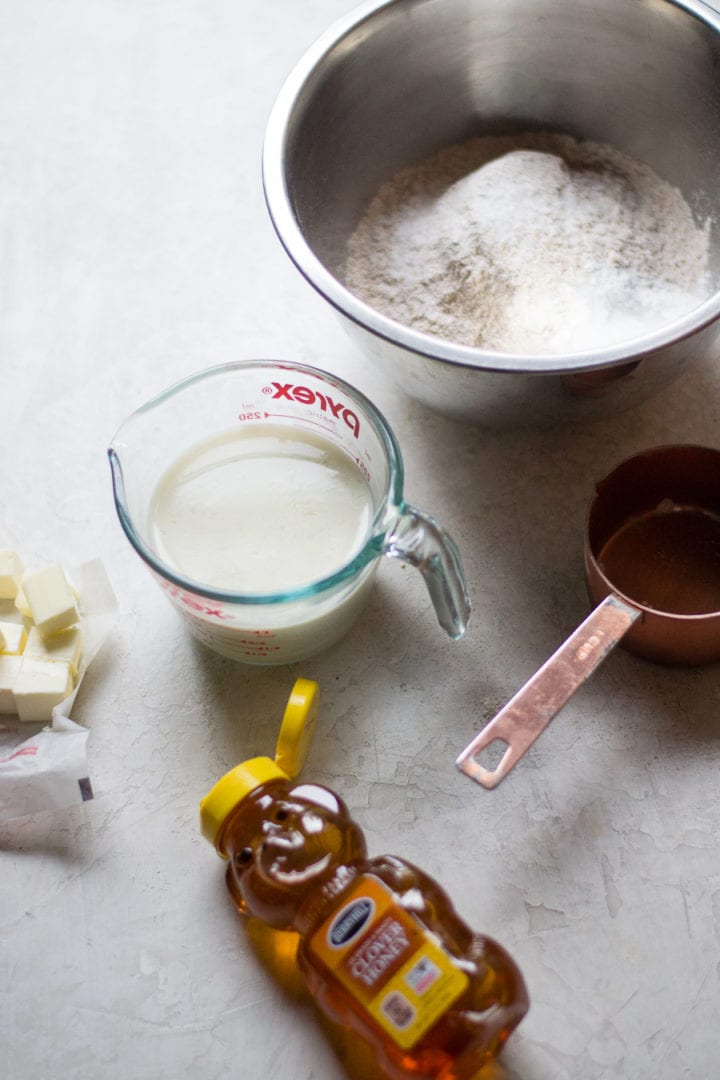 The recipe for honey wheat drop biscuits consists of whole wheat flour, cold butter, cold buttermilk, and honey.