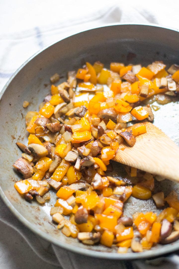 - Reduce the heat to medium and add the mushrooms, peppers, and onions. Season with a pinch of salt and pepper and cook for about 10 minutes.