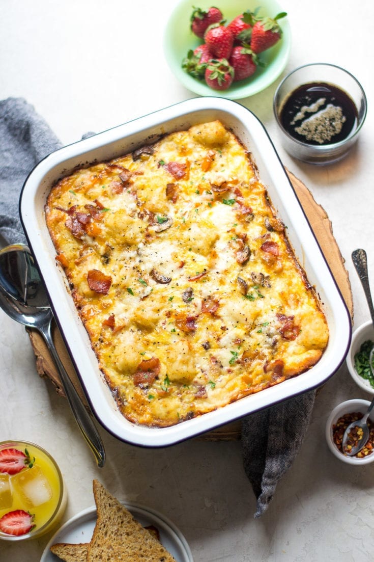 The casserole can be prepped the night before (yes, eggs and all) and then kept in the fridge overnight.